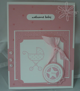 This card was inspired by a boy card that I saw here. I made the card pink and used the SU stamps sets Fast and Easy Notes and In the Stars. The ribbon is Paper Trey Ink and I used Bella Baubles. The background cardstock was made using a Printworks polka dot template. I also used my swiss dots cuttlebug embossing folder.